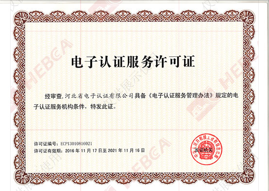 2016年11月河北省電子認(rèn)證有限公司取得國家工業(yè)和信息化部換發(fā)的《電子認(rèn)證服務(wù)許可證》。